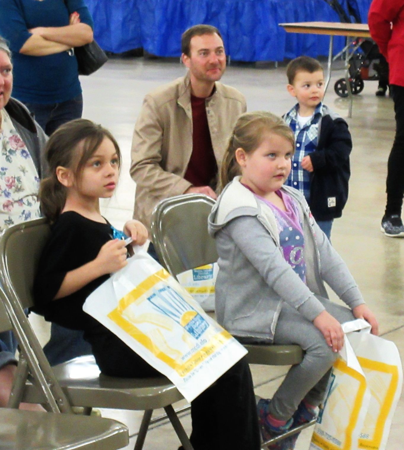 Jordynn Perry (left) and Isabella Mitchell are entranced by the performance of Jake the Juggler at the Family-A-Fair. Jesse Borgelt (back) and his 3-year-old son Vincent also seem impressed with the show. Photo by GLENN WOJCIAK