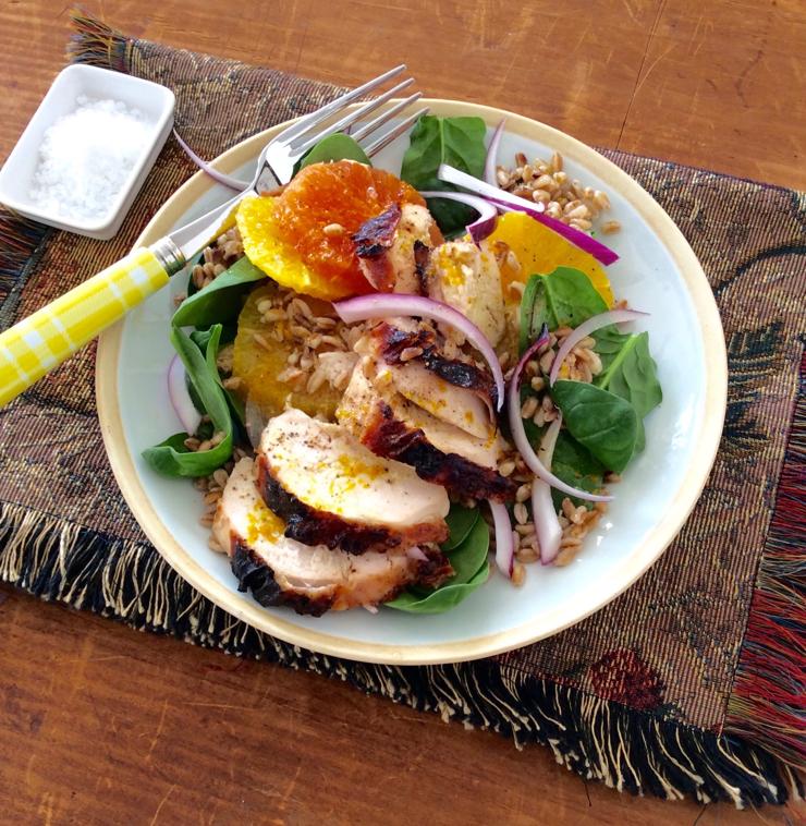 We think of chicken salad as a mild-weather dish, but it’s too versatile to be off limits the rest of the year. If you toss the poultry with a grain while both are still warm, then add some greens, you get a mixture satisfying for a blustery night. Chicken breasts roasted on the bone have the most flavor. While boneless breasts might be easier for some cooks to handle, the meat doesn’t have the skin intact, and that bastes it while it roasts. Thin lobes of skinless boneless poultry dry out quickly in the oven. Marinate the chicken briefly in orange juice with a splash of soy sauce. After roasting, remove the cooked meat from the bone in one piece, slice it, and lay it on a bed of baby spinach and farro.