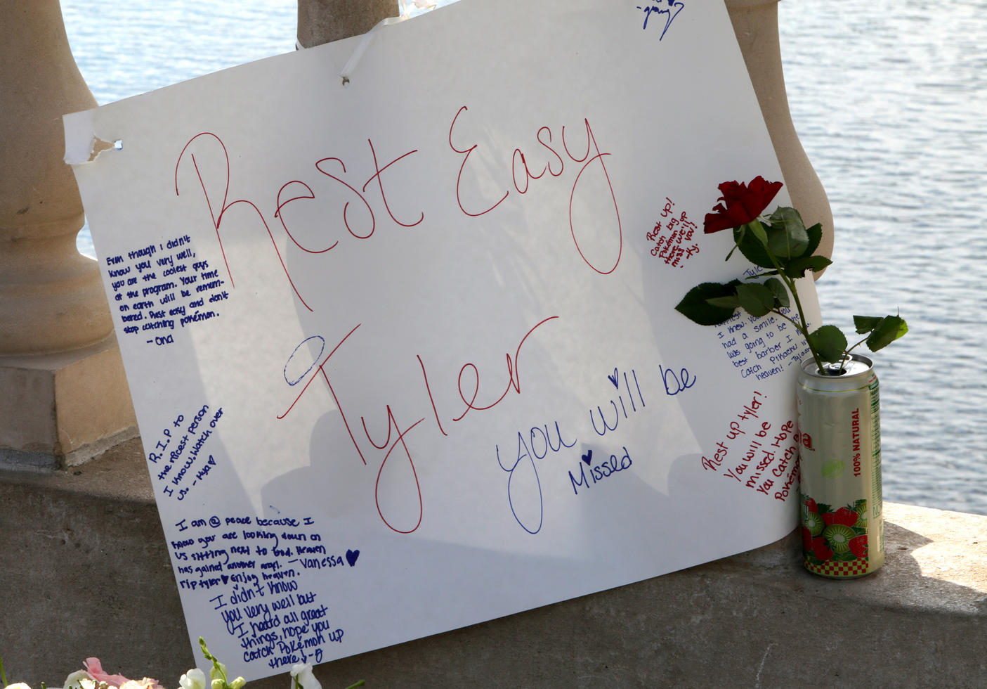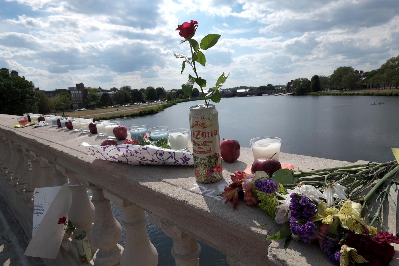 Overnight, a small memorial was begun at the bridge, made of flowers, candles, and half a dozen cans of Arizona kiwi strawberry juice. A simple message was spelled out on small yellow note papers: “For Tyler.’’
