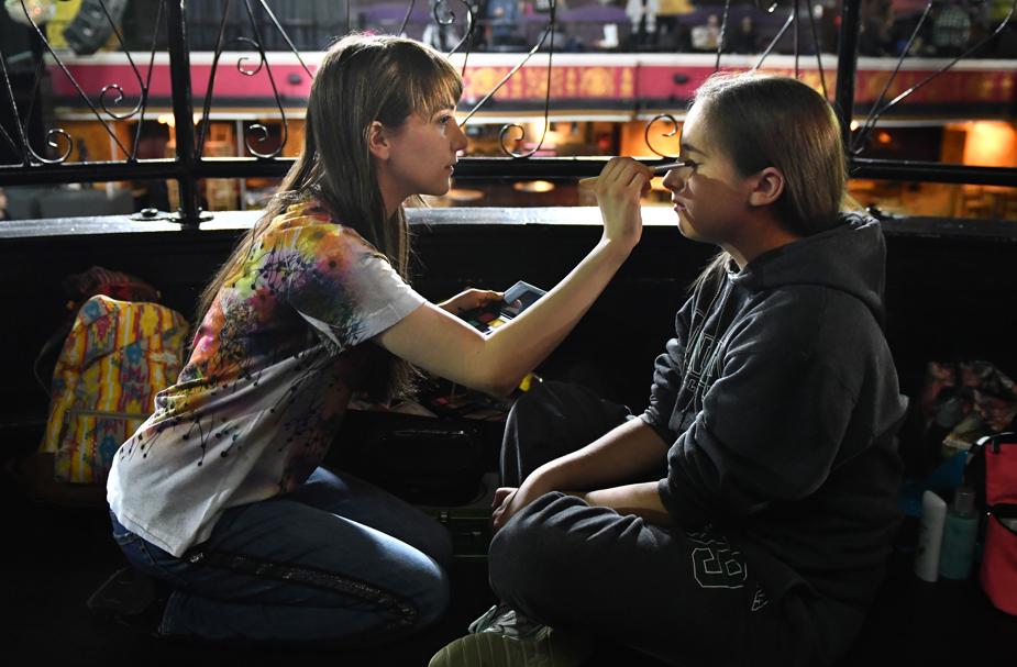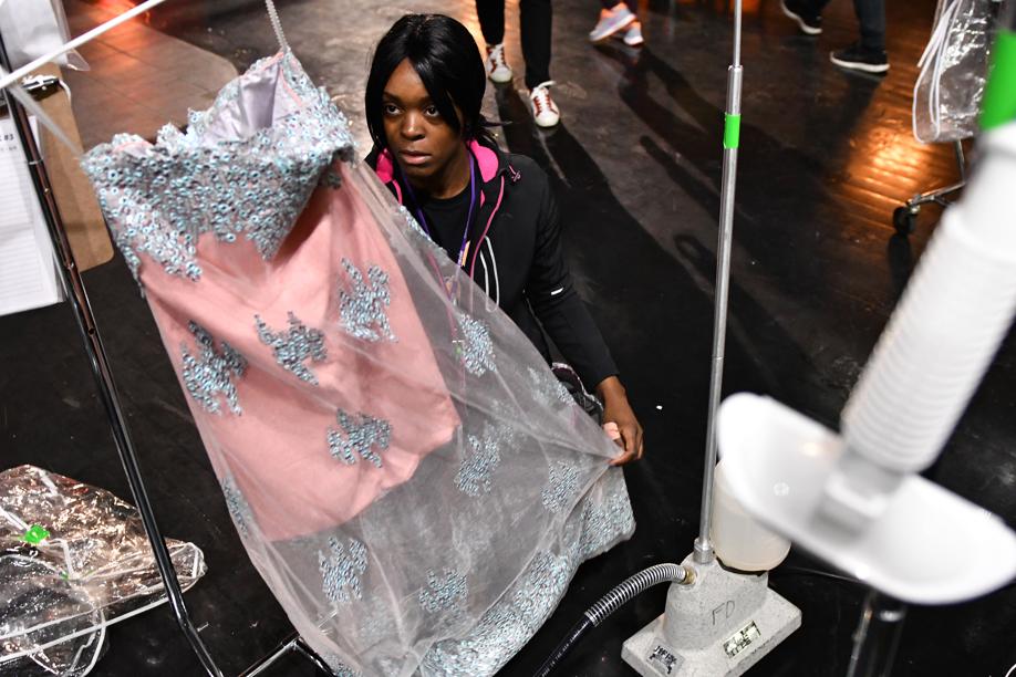 That morning, three school buses transported the students to Club Royale in Boston’s Theatre District, where designers unpacked their collections, pressed them with hand-held steamers, and hurried to make last-minute adjustments with pins, needles, and thread while curling irons heated and students who weren’t too nervous to eat made quick breakfasts of coffee and pastries.