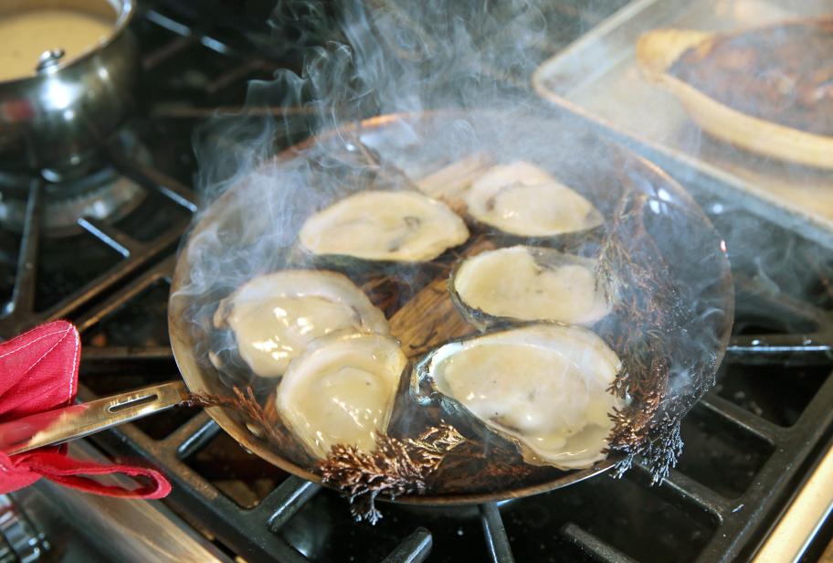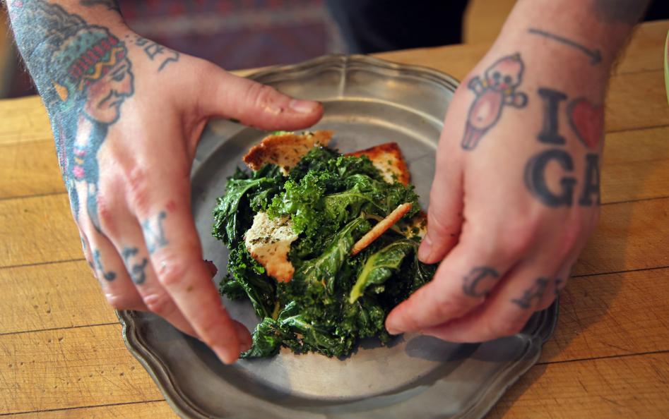 Baltzley can’t help himself. On a recent afternoon in Falmouth — a knit cap pulled over his pile of dreadlocks, and wearing a black T-shirt that reveals the root vegetables and Native American motifs inked on his hands and arms — the chef and his curly-haired sous prepared a few items from the 41-70 menu: Caesar salad with charred kale and swordfish dressed with freshwater seaweed, sea buckthorn, yolk, sardines, and candied kelp; oysters harvested by Baltzley off nearby Washburn Island and smoked on splinters of cedar and oak with juniper beurre monte; and Portuguese sweet bread with chourico butter and beach plum jam. All of it uncommon, and uncommonly delicious.