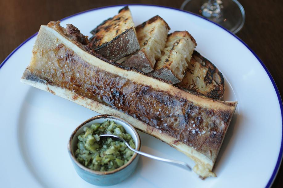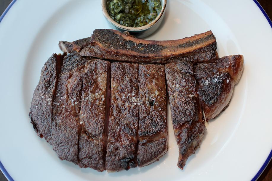 Rib eye for two, on the other hand, resurrects that marrow bone and pairs it with a 24-or-so-ounce bone-in rib eye, sliced and served with fingerlings and a vinegary herb paste. What do you do with the marrow? Whatever you want, really: smear it on the potatoes or right on the beef — an umami festival that stands up to the bright flavors of the first and second courses.