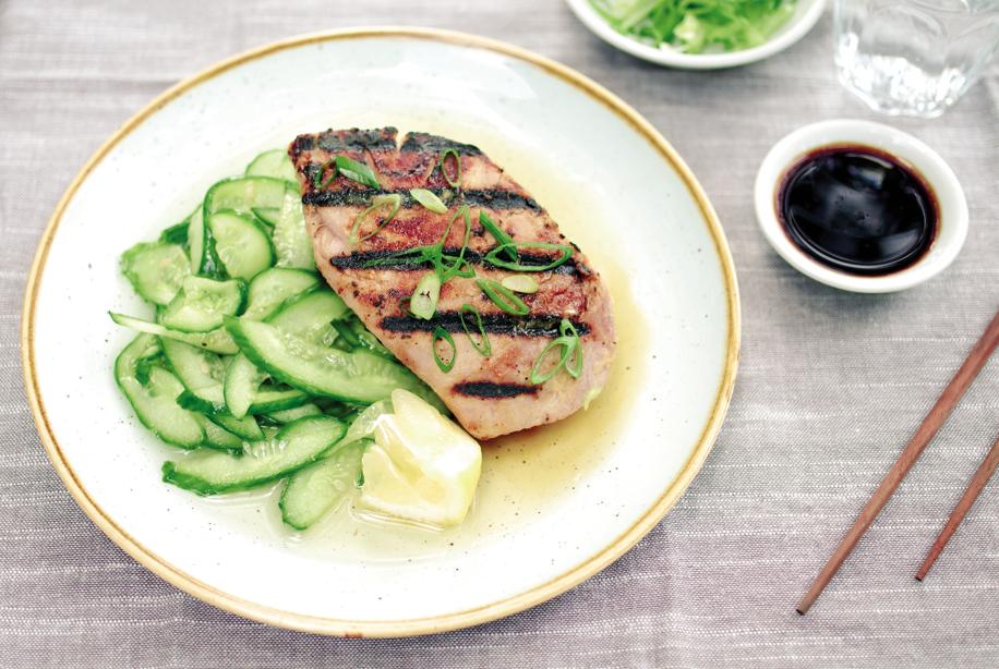 Thin slices of sweet-and-sour cucumber pickle provide a refreshing and crisp counterpoint to savory, miso-coated grilled tuna. Long ago, Japanese cooks discovered that marinating fish in miso, a fermented bean paste, preserved and tenderized it, while complementing its briny flavor. It was a staple in Japanese households before refrigeration, and is still a popular dish. Miso is available in several varieties, but the light or “white’’ miso is the least salty and best used in marinades, dressings, and soups. Tightly sealed, it will keep refrigerated for up to a year, but it’s a good idea to check the best-by date.