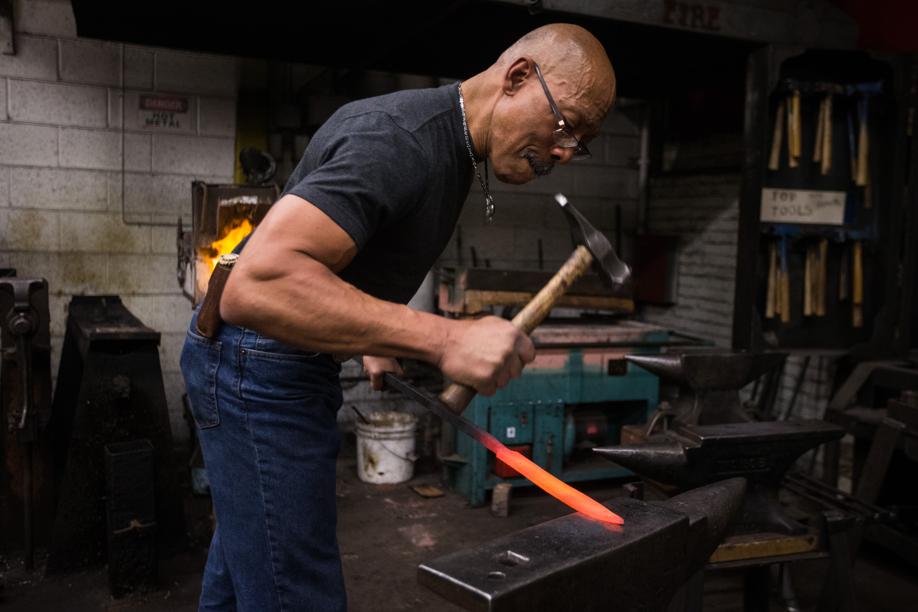 Smith, who wears a diamond stud in one ear and a backward leather cap, works as he talks. He pulls a steel rod from a gas forge about the size of a breadbasket, heated to 2,300 degrees. He lays the blade-shaped end of the rod on an anvil and hammers it, quickly and decisively, periodically inspecting the shape.