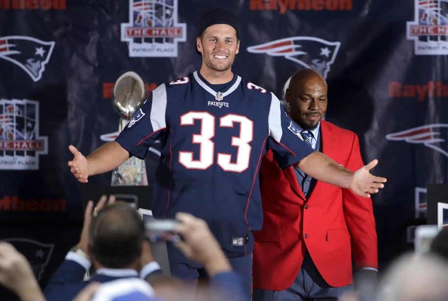 Emerging at the stage near the end of the ceremony, Brady showed up in a sweat jacket and shorts. As the crowd buzzed he slowly unzipped his jacket to reveal a Faulk No. 33 jersey.