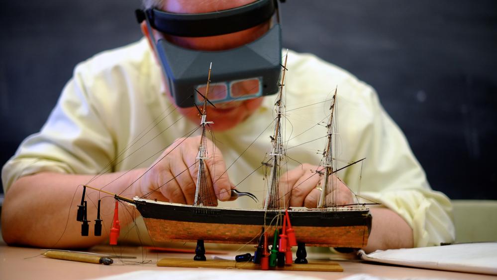 One works exclusively with paper the thickness of business cards. After designing the pieces with a computer program, “he cuts it out, glues it together, and it becomes a battleship,’’ said Consalvo, who can explain how to rig a sailing ship, plank a hull, or build a frame. The center has a woodworking shop with a band saw, drill press, and lathe. And if everyone is stumped on a design, the class has its own library on the history of ships.