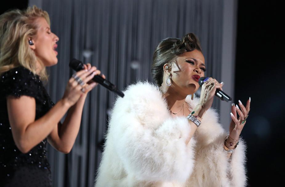 A. I wasn’t nervous about working with her. It was [Grammy producer] Ken [Ehrlich’s] brainchild. First of all, I was just grateful that he was like, “Hey, you’re going to perform on the Grammys.’’ We were happy to do the collaboration, but what we weren’t sure about was how the two songs were going to mesh. They’re different in tone, different keys, different time signatures, so we were like, how are we going to work this? But Greg Phillinganes is a brilliant musical director and composer. And he ended up mashing them up and sent us the music, and we gave him back our suggestions about how we wanted it to be more acoustic and how we’d like to see it flow, and we ended up with a such an interesting and unexpected piece of work. It ended up being really powerful and I am telling you, I could not have asked for a better partner than Ellie Goulding: Talent-wise, personality-wise, she was so lovely. We laughed most of the time, and I made a friend out of it.