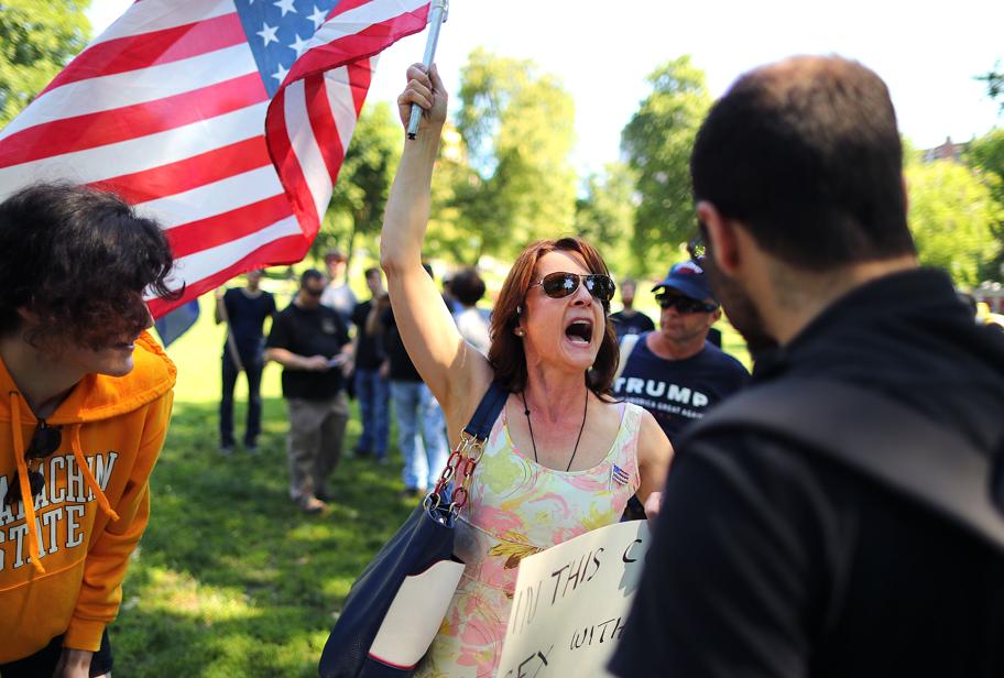 The rally drew about 75 protesters and an equal number of counter-protesters. For the two hours the groups stood on the Common as protesters and counter-protesters mingled with each other, shouting, swearing, laughing derisively, and filming each other.