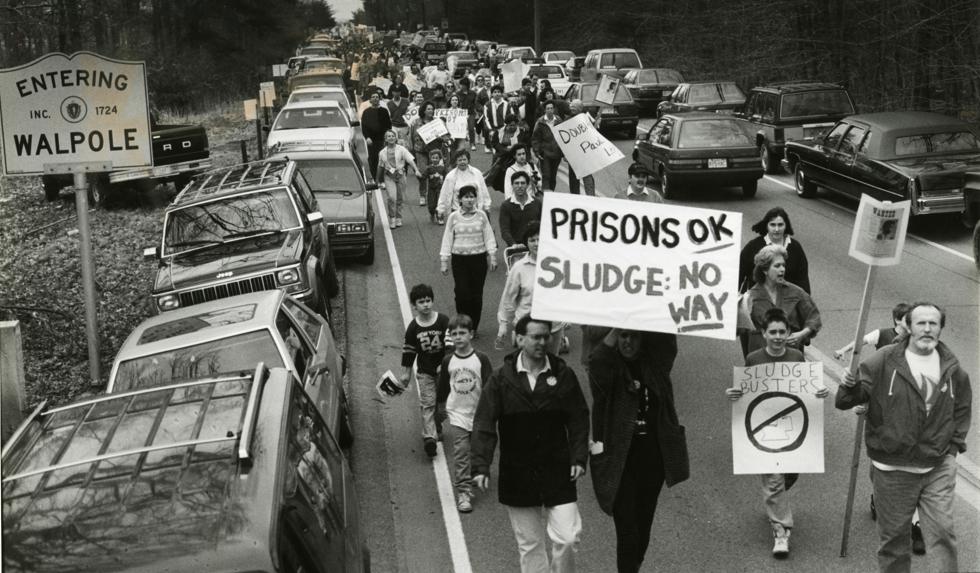 Walpole and Norfolk residents marched along Route 1A on March 17, 1990, to protest a proposal to build a sludge dump next to the state prison at Cedar Junction. Residents said the site bordered watersheds that fed wells at the prison and waterways leading to the Charles River, according to a Globe article. The sludge dump was never built in town.