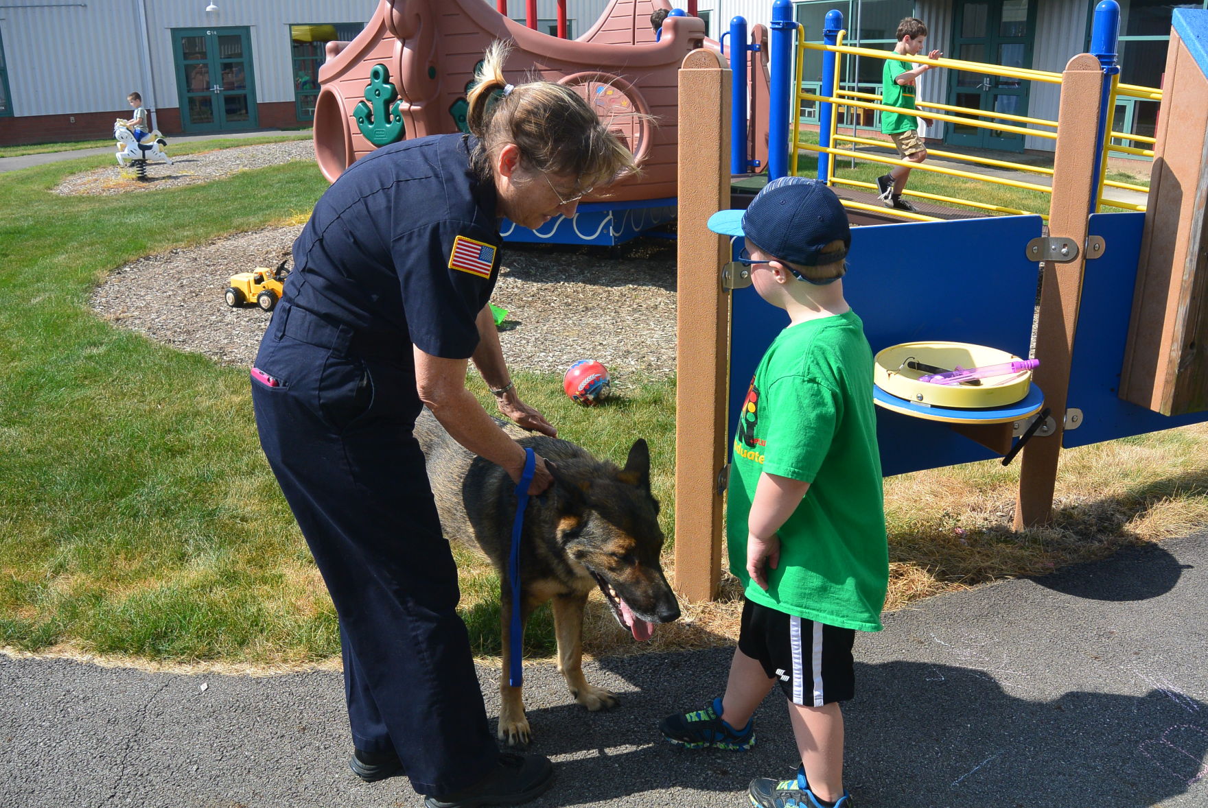 Lydia Wochna, of the Granger Fire Department, brought her therapy dog, Kurt, to interact with the students as they played outside on the playground.