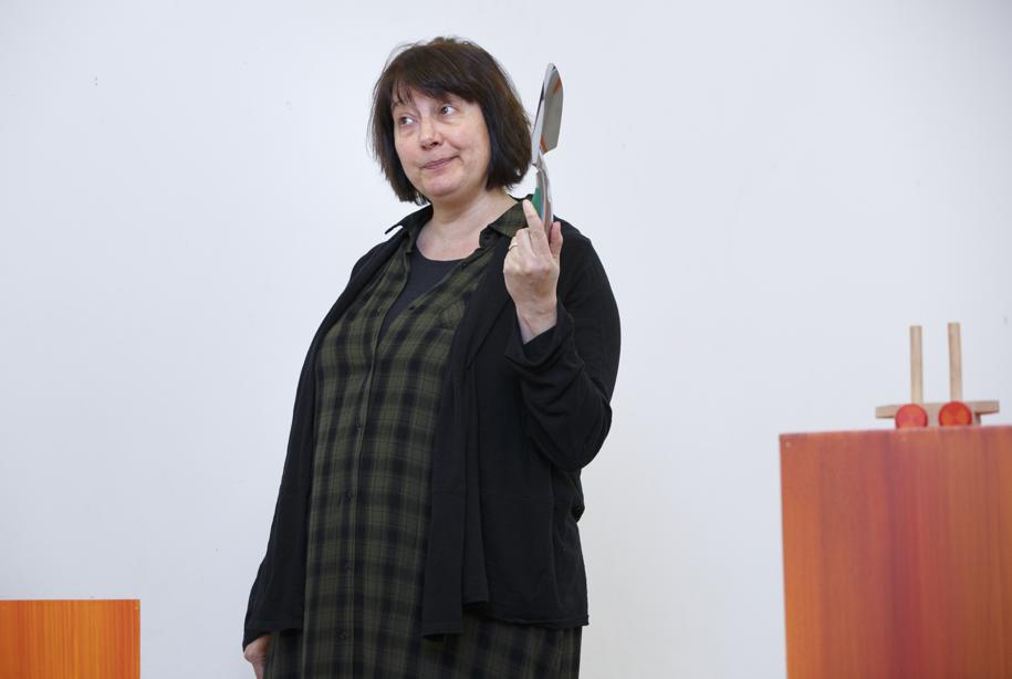 On New Rep’s rehearsal stage, actress Adrianne Krstansky, who plays Vivienne, moves around an area punctuated by pedestals, each holding one ordinary household object. As she selects an item — a red marker, an iron, a trowel — and builds a story around it, these ordinary objects provide a kind of comfort and reassurance, Krstansky says.