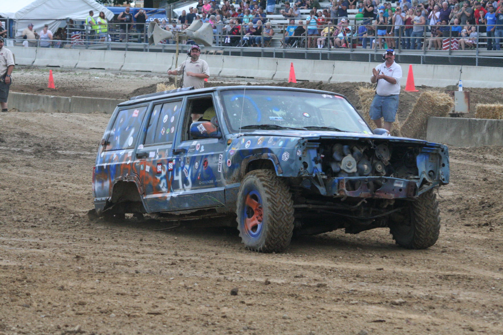 With a stuffed animal Minion by his side, driver Casey Columbus of Chatham managed to finish the Rough Truck course Aug. 1 despite losing his rear axel after driving through some logs. Photo by ALLISON WOOD