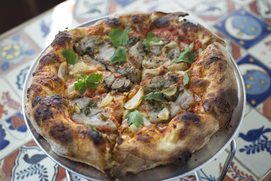 Take for example the porchetta pizza ($10), sporting a sumptuous, puffed crust, gently blistered from the oven’s high heat. The 12-inch pie is slathered with a bright, flavorful sauce of crushed tomatoes, mozzarella, roasted fennel, zingy cherry peppers, and delectably thin slices of pork roast. The chef butterflies a shoulder cut, marinates it, then adds a layer of breadcrumbs, rosemary, basil, and lemon zest. The rolled and trussed meat is roasted low and slow for hours. No cutting corners here.