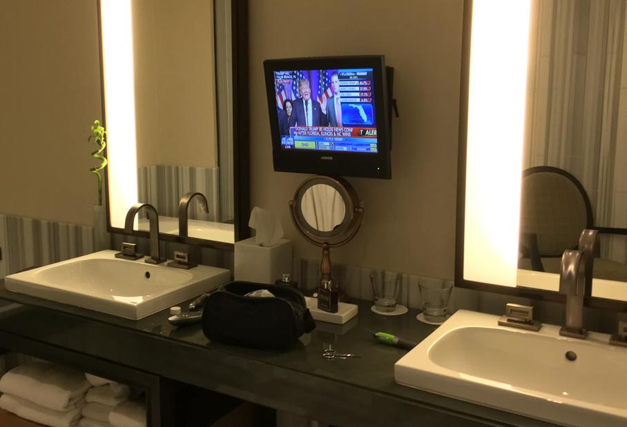To hear Trump’s victory speech without the music, this reporter elected to watch it on the bathroom TV while soaking in the tub.