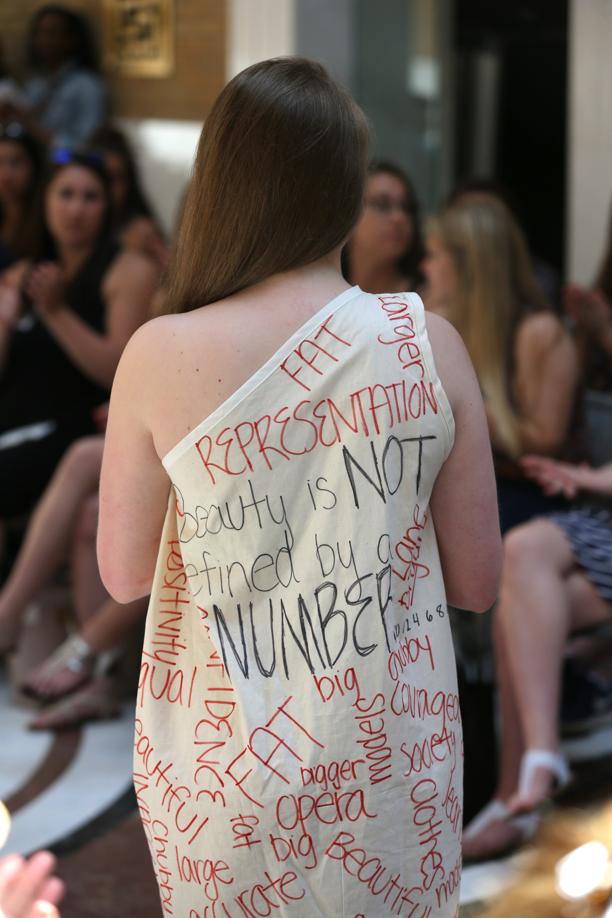 On the back of the dresses were positive phrases, such as “Beauty is not defined by a number.’’
