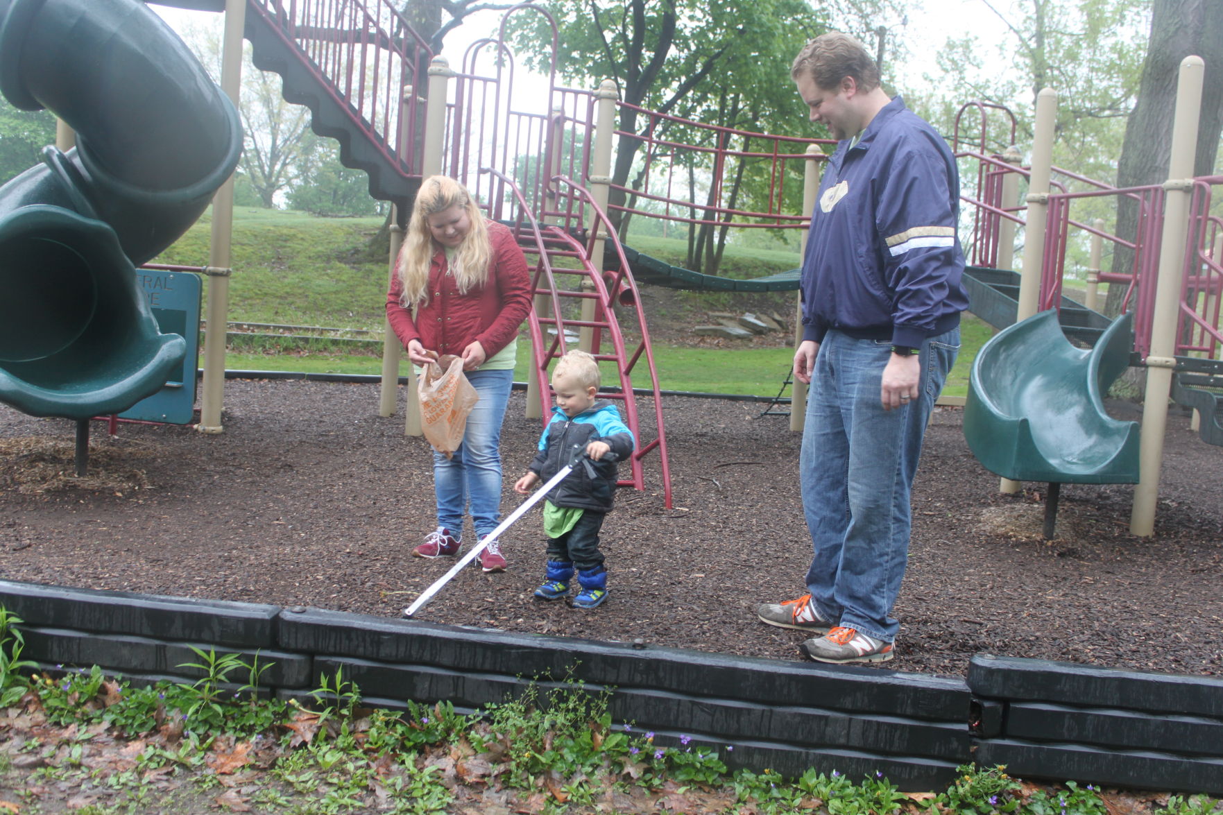 Rachel, Logan and Justin James pick up trash in the playground area. Photo by EMILY CANNING-DEAN