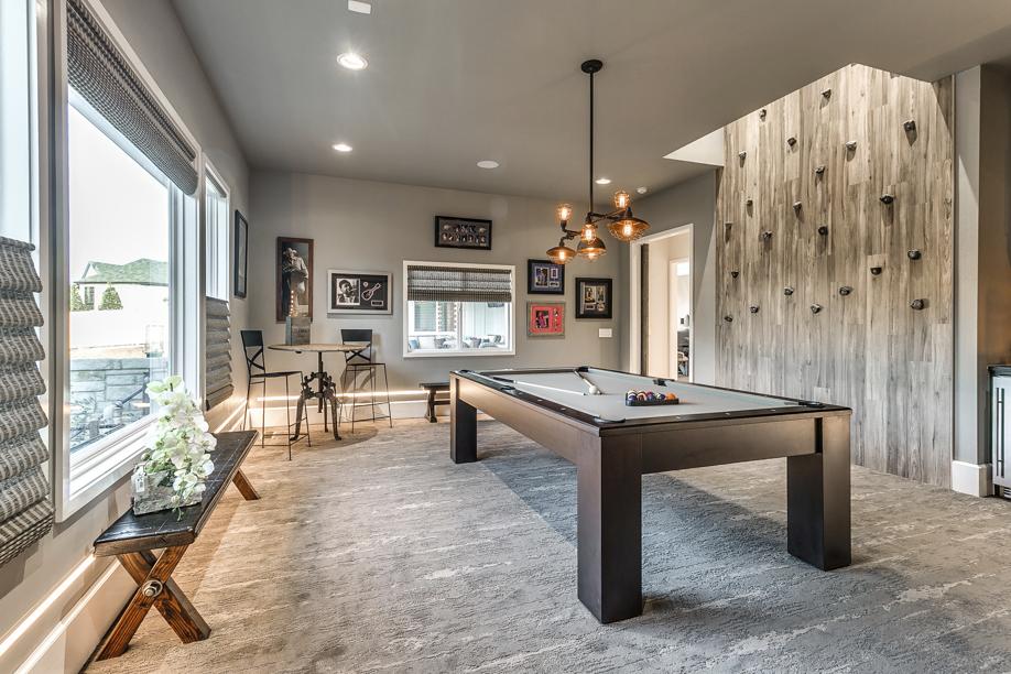 Unlike old-time rec rooms with their wood paneling, ceiling tiles, box TVs, and castoff furniture, this one measures about 800 square feet on the main floor, with space for watching TV, shooting pool, rock climbing, and more.
