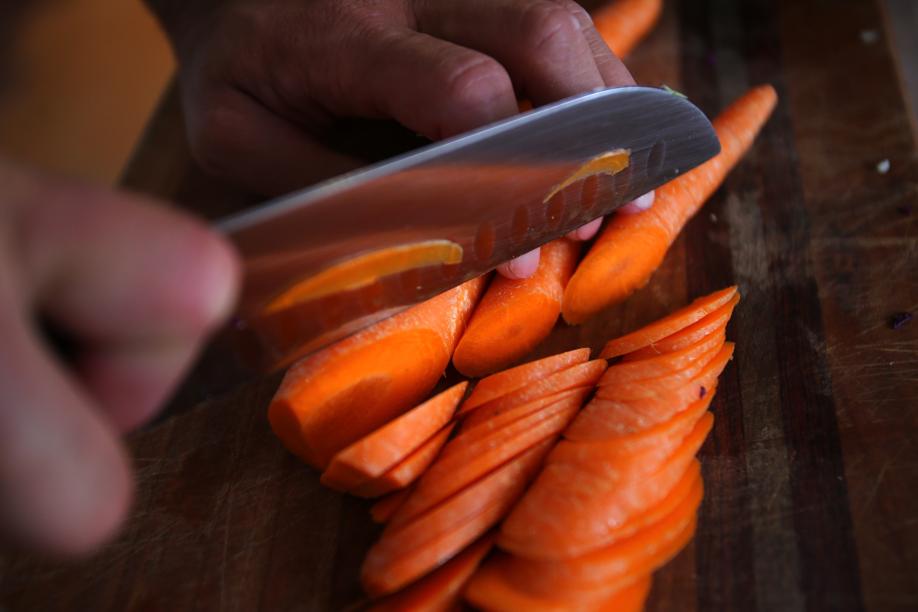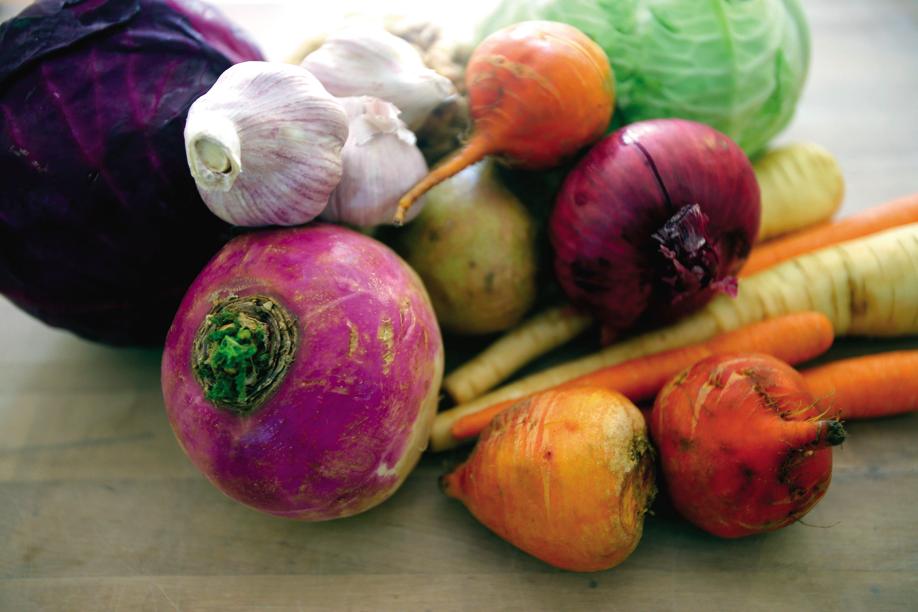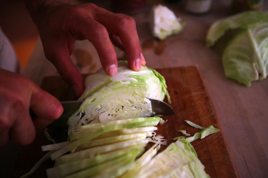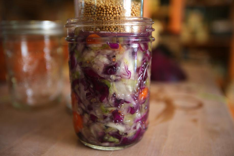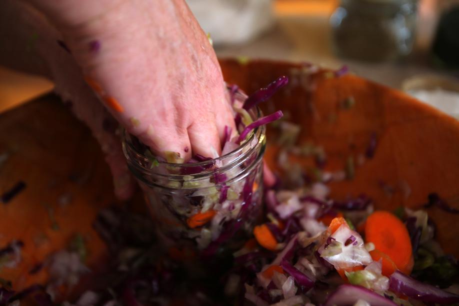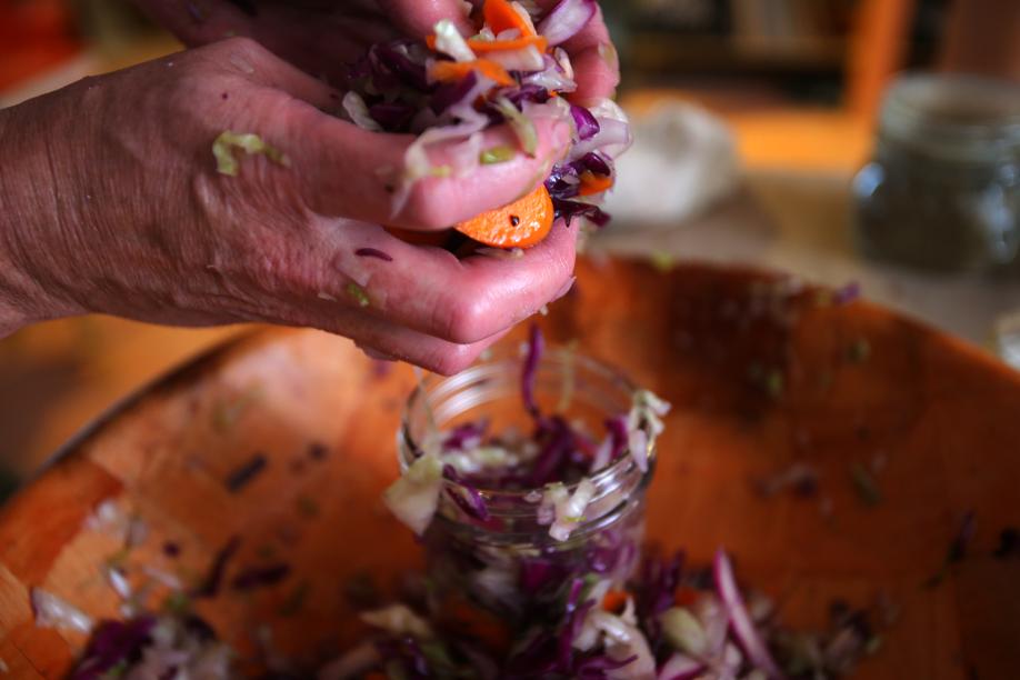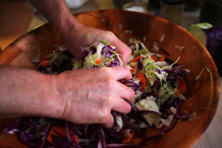 So we get down to business — shredding cabbage, salting and wringing it out to break down the cellular walls, releasing the liquid. We pack it into jars and weigh it down. If there is one rule, it’s that the final ferment must be anaerobic, meaning the vegetables should be covered with liquid, whether their own or additional brine. This is called lacto-fermenting. Within hours, microorganisms and bacteria are set in motion, with lactobacillus bacteria the dominant factor. It’s the lactobacillus that converts vegetables’ natural sugars into lactic acid, accounting for the sour flavor. When the sauerkraut is as sour as you like it, stick it in the fridge. Though it continues to ferment, the cold slows it down.