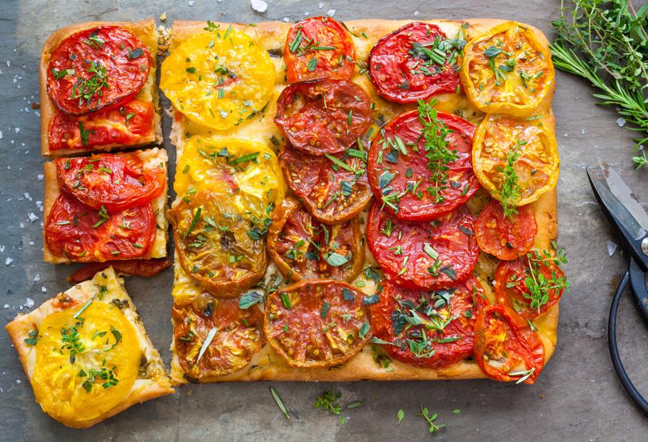 Olive oil, and then more olive oil, is the key to delicious focaccia. In this tomato-topped version, supermarket pizza dough is transformed into a thick, herby flatbread by giving the cold dough time to rise in a warm place and then pre-baking it for a few minutes so the dough rises to its full potential. Top with tomatoes, plenty of salt, and herbs, and bake again. The juices from the tomatoes sink into the dough and flavor the bread. Use an array of heirloom tomatoes in various colors to make a colorful pattern on top. Five ingredients make a spectacular dish. Leftovers for breakfast.