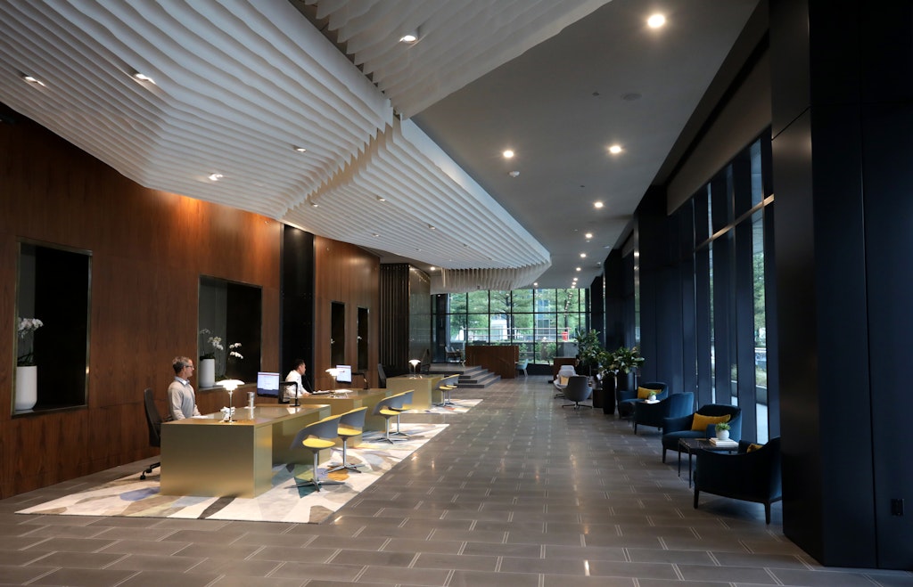 The spacious lobby area along Field Street includes a coffee shop, a posh bar area for residents and a coworking center.