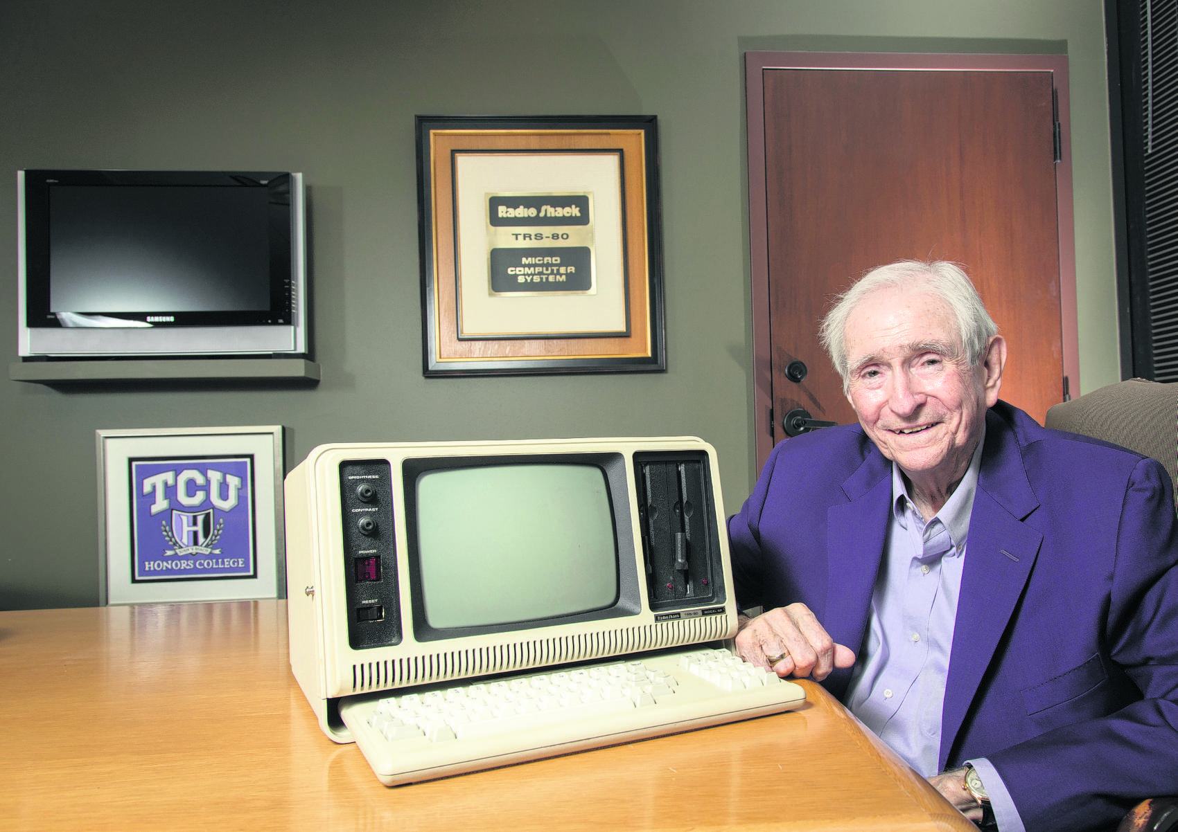 John Roach, the former chairman and CEO of Tandy Corp., poses with one of the original Radio Shack TRS-80 Model 4P portable micro computers in his office in June 2021.