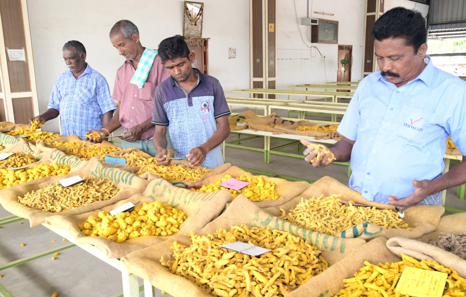 Farmers place their samples by 9 a.m. on the tables at the auctioning centre in the Turmeric Market Complex. Buyers break the roots to test the colour and freshness of the turmeric and quote the price in the app. Traders from across the country bid online.