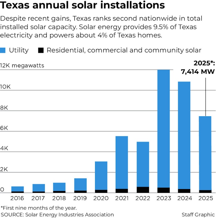Texas installed 7.4 gigawatts of new solar capacity in the first nine months of 2025, nearly double the second-closest state, which was California at 3.8 gigawatts.