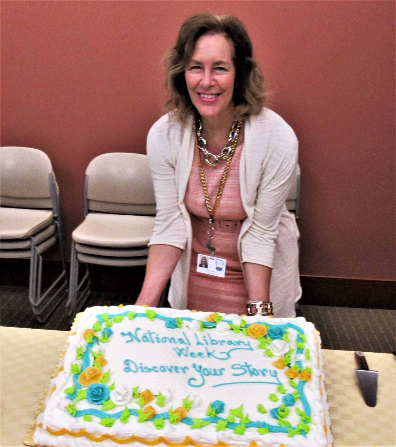 Medina County District Library Director Carol Kowell shows supporters a cake to celebrate National Library Week and the Medina Library’s 110th birthday. Photo by GLENN WOJCIAK