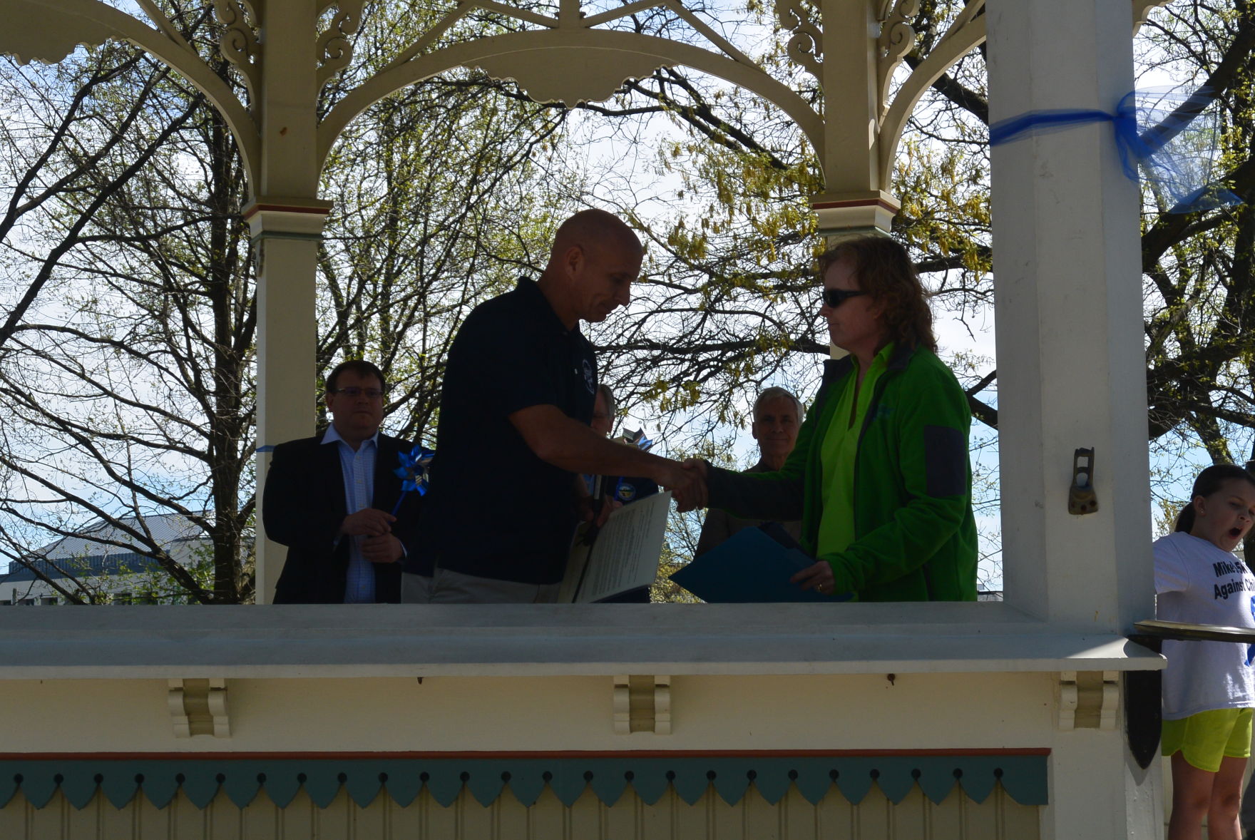 Before the walk, Medina County Commissioner Adam Friedrick presented Children’s Center of Medina County executive director Rhonda Wurgler with a proclamation declaring April 2017 as Child Abuse Awareness and Prevention Month in Medina County. Photo by SCOTT KRISKA