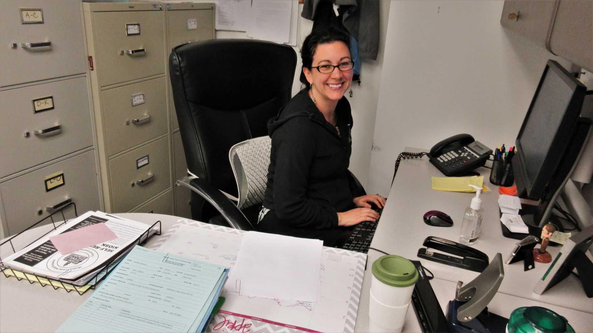 Probation Officer Stephanie Theus works in a cramped office in which her chair and desk compete for space with filing cabinets. Photo by GLENN WOJCIAK