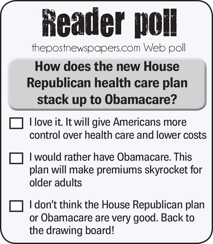 Think I am wrong? Let me know by voting on this week's poll question "How does the new House Republican health care plan stack up to Obamacare?" Cast your vote and feel free to comment at thepostnewspapers.com (or your hometown Post website). You have until Tuesday to set me straight.