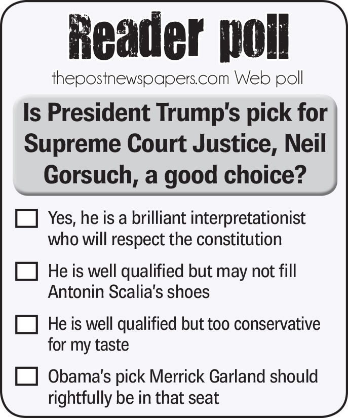 So that brings us to this week's Reader Poll question: Is President Trump’s pick for Supreme Court Justice, Neil Gorsuch, a good choice? Go to your local Post website or our combined thepostnewspapers.com to let your fellow local readers know how you feel.