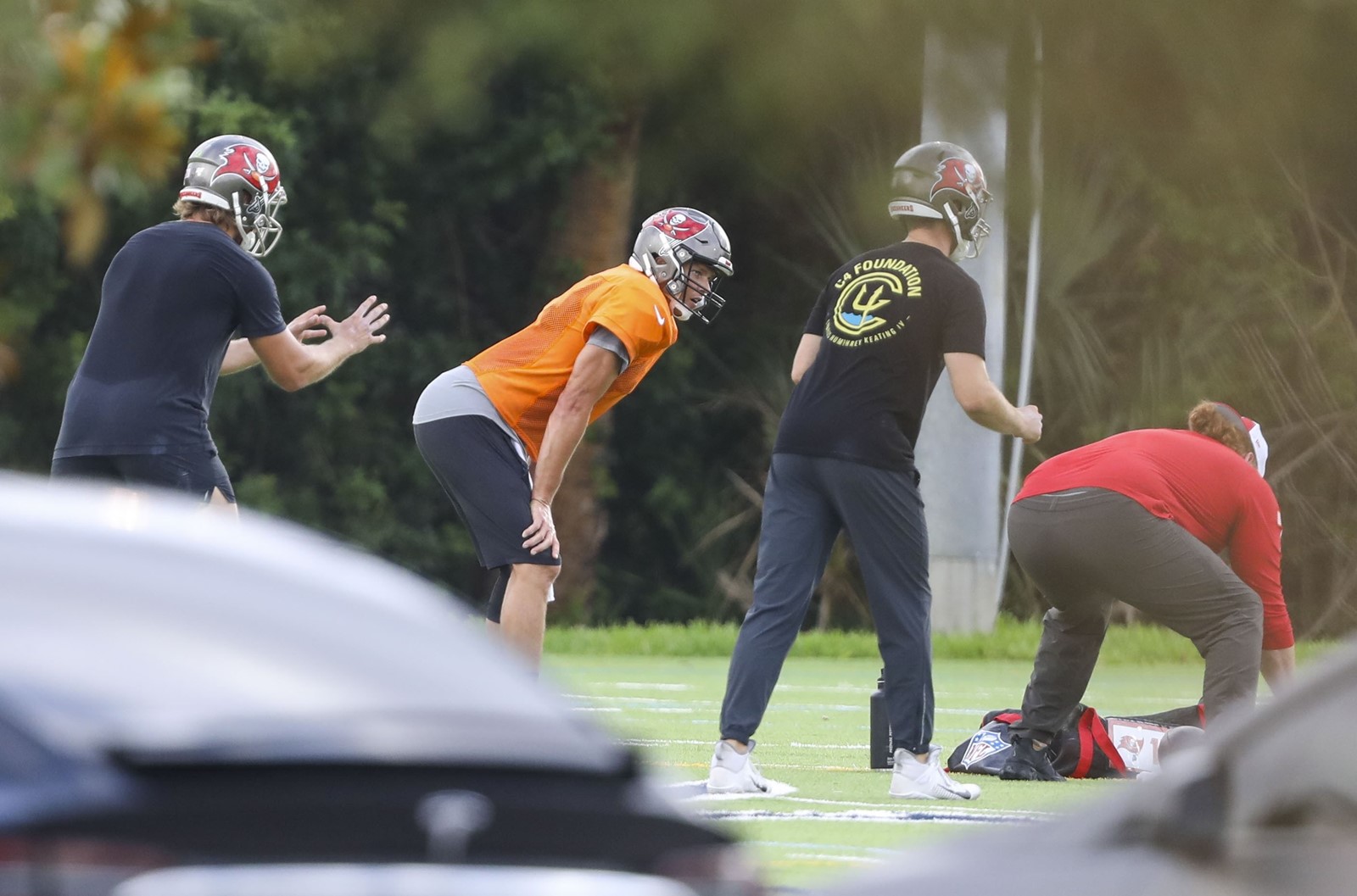 Tom Brady, top and right, isn’t letting the coronavirus pandemic — or NFL rules against players working out at team facilities — keep him from preparing for a new season with his new team. Brady gathered some of his Buccaneers teammates on a high school field early Tuesday for a throwing session. Brady wore a Bucs helmet and an orange jersey over his shoulder pads. The informal, players-only workout at Berkeley Preparatory School lasted two hours, the Tampa Bay Times reported.
