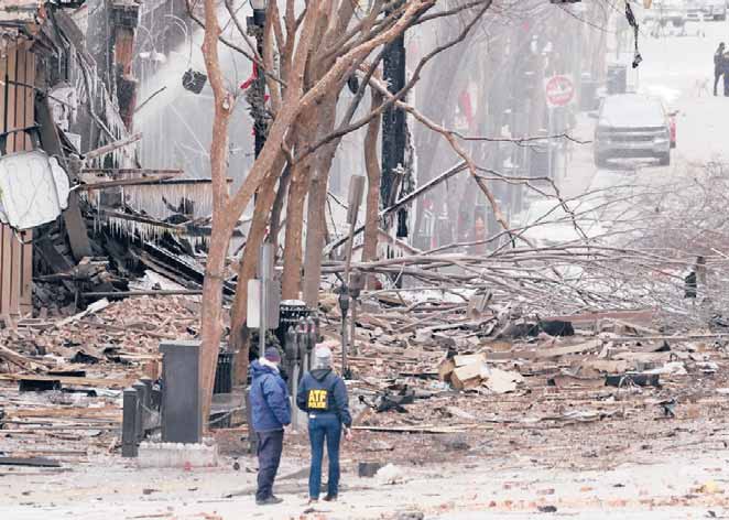 The chief said investigators at the scene “have found tissue that we believe could be remains, but we’ll have that examined and let you know at that time.” Police Emergency personnel work near the scene of a Friday morning explosion in downtown Nashville that shattered windows, shook buildings in the area and beyond, set cars on fire and blew trees apart. MARK HUMPHREY/AP could not say whether it potentially came from someone inside the RV.