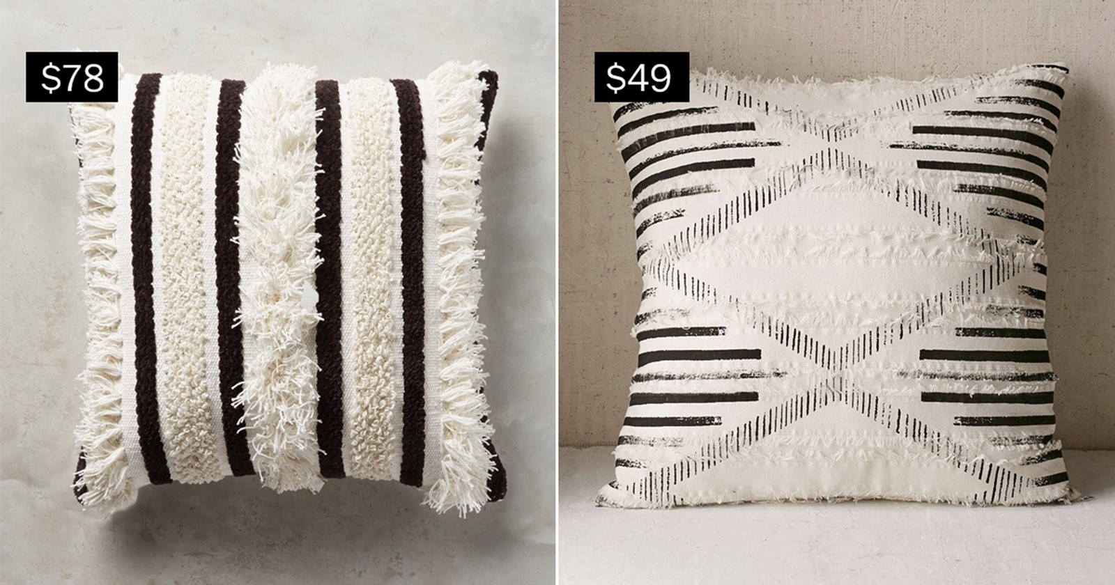 20-inch textured Indira pillow, left, from anthropologie.com; printed eyelash pillow from urbanoutfitters.com.