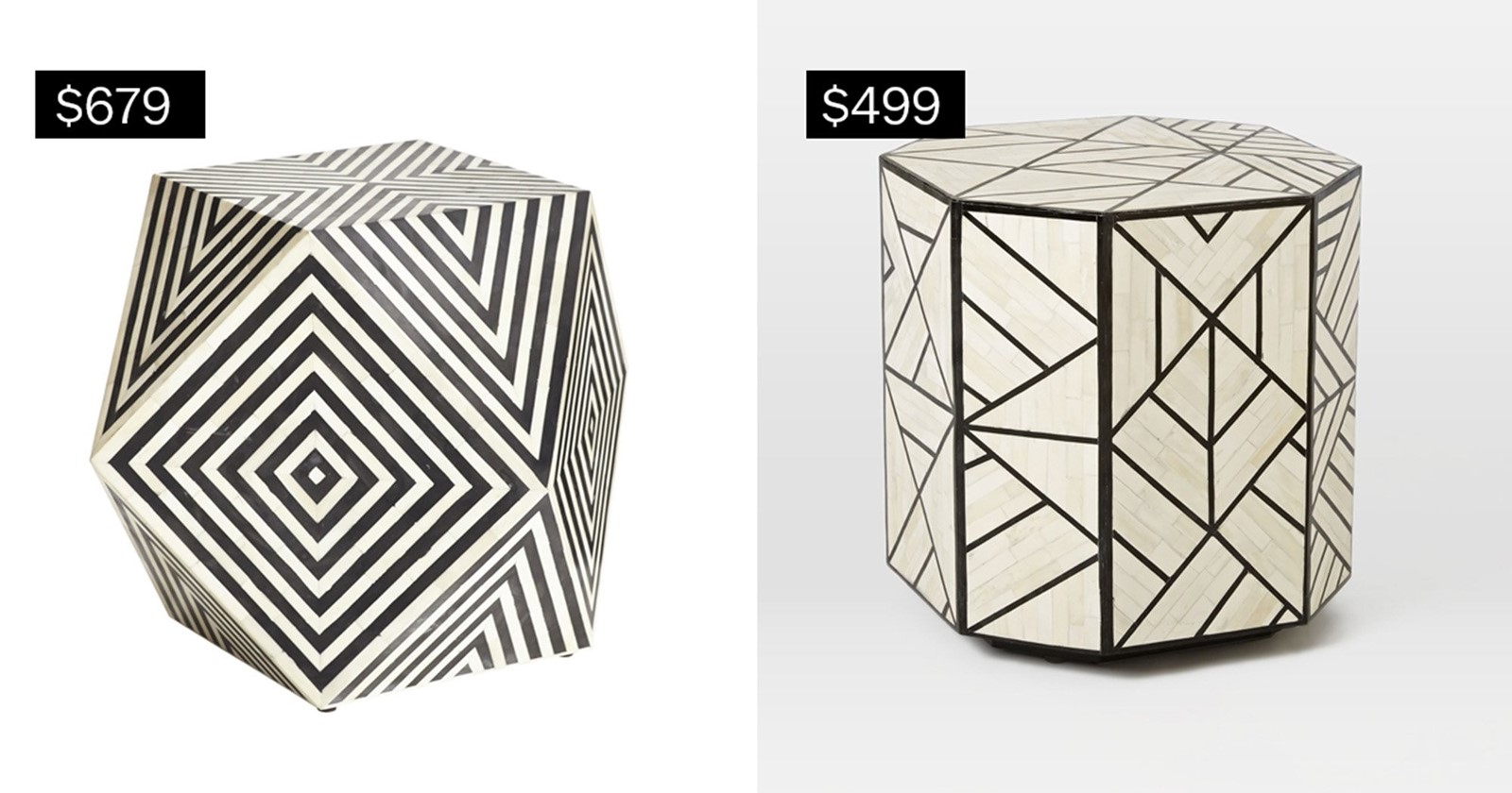Tetradeca bone-and-wood table, left, from wisteria.com; bone-inlaid side table from westelm.com.