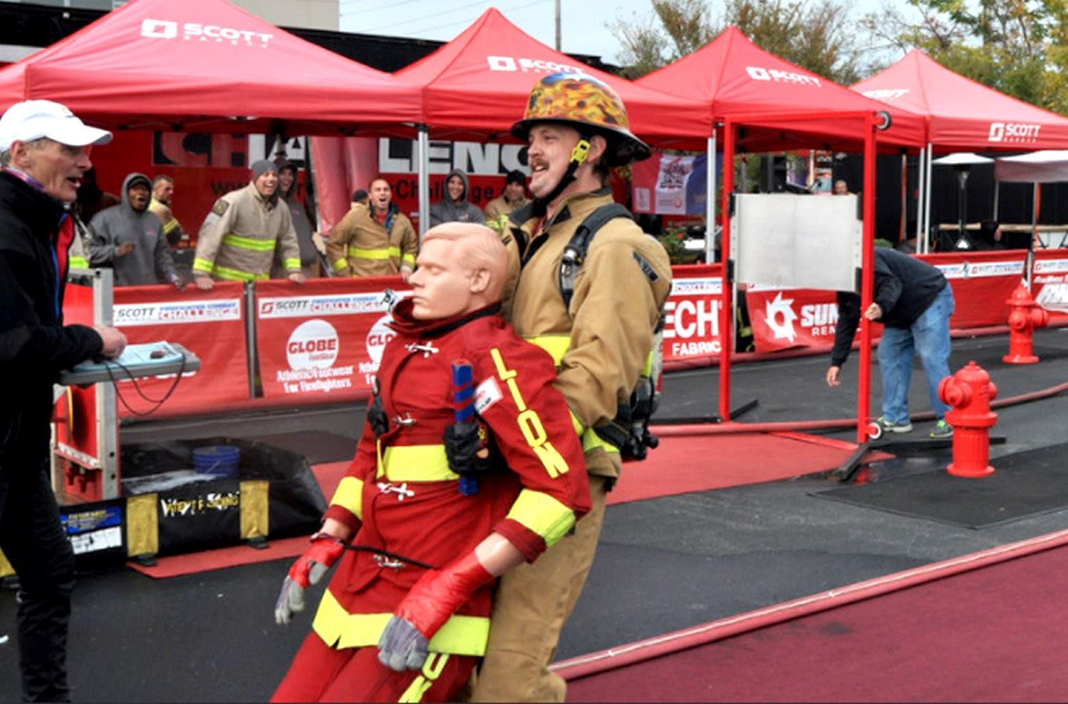 Firefighters compete against one another individually as well as in teams in a grueling series of five tasks that include scaling a five-story tower, hauling gear up to the tower, dragging fire hoses and rescuing a life-size fire victim. Firefighters complete all five while wearing full bunker gear and a Scott breathing apparatus.