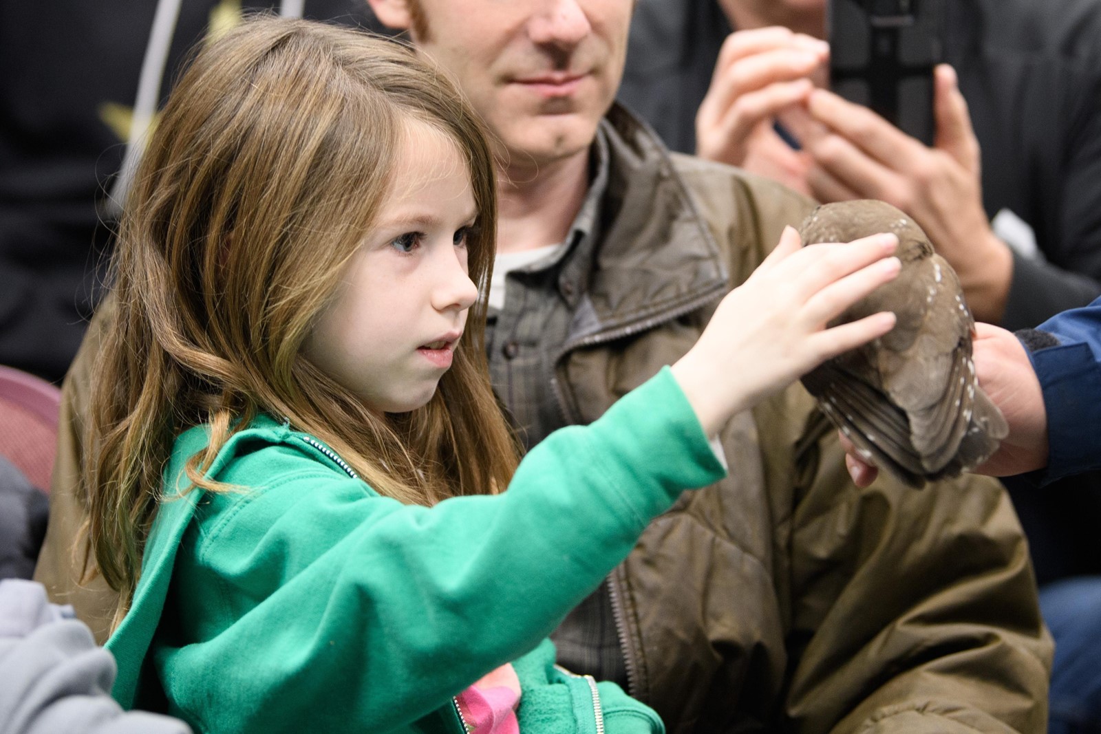 Before long, Bumgardner arrived carrying a small white cloth sack with something moving inside. Other people also showed up at the visitor center auditorium to take a look at the owl, including Cassidy and her dad, Rob Hallock, who live nearby and got a text alert about the capture as well.
