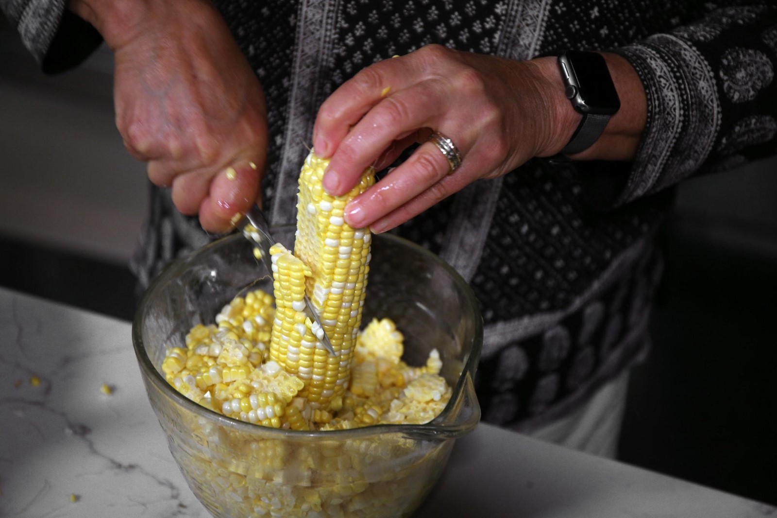 1. Use your nonknife hand to stand a shucked ear on your cutting board or in a large bowl, like Lucy holding the football for Charlie Brown. Starting halfway up, cut down along the cob with a chef’s knife, releasing the kernels onto the cutting board. After each cut, rotate the cob toward you and repeat until you’ve gone all the way around. Flip the corn over and repeat.