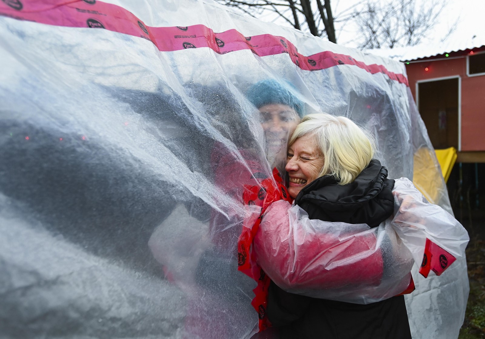 Carolyn Ellis, left, creator of the hug glove, hugs her mother Susan Watts, 74, in her backyard on Christmas Eve during the COVID-19 pandemic in Guelph, Ontario. Watts is a retired nurse who lives in an apartment nearby and gets to come over outside and hug her daughter’s family. (Nathan Denette/AP )
